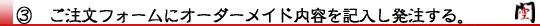 ご注文のページを開き、オーダーメイド方法の説明と照らし合わせながら、ご注文フォームに必要事項をご記入になり、発注します。